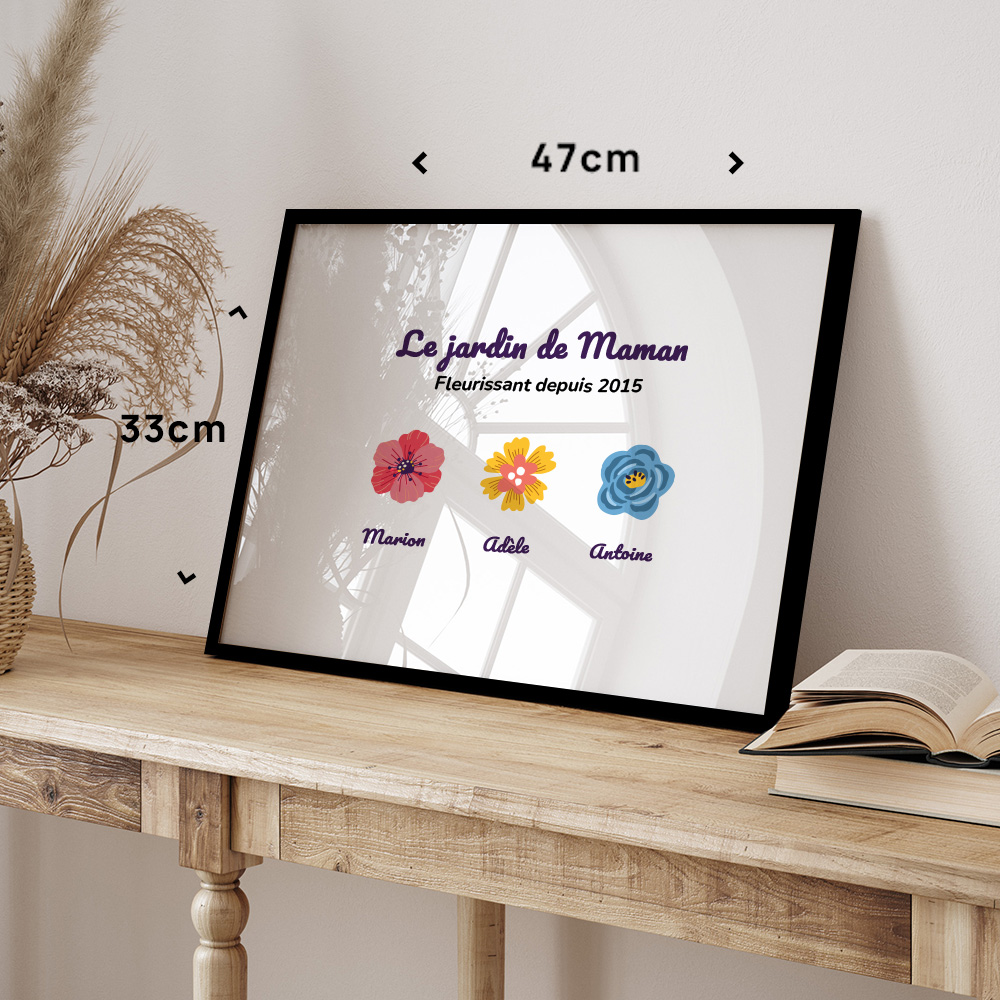 Avec son format idéal et son cadre noir élégant, cette affiche personnalisée prénoms enfants et fleurs trouvera facilement sa place dans n’importe quelle pièce. Un souvenir intemporel, qui rappellera chaque jour à votre maman ou grand-mère combien elle est aimée. Chaque regard posé sur cette affiche personnalisée famille fleurs lui rappellera l’amour inconditionnel de sa famille. Un cadeau touchant qui fera son effet à coup sûr !