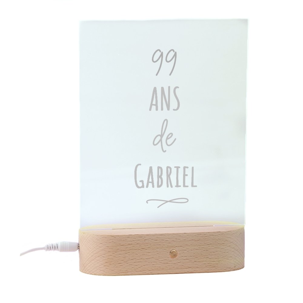 Pour célébrer les 99 ans d'un homme spécial, rien de tel qu'une lampe 3D plexi personnalisée avec son prénom et un message unique. Cette lampe 3D personnalisable est un cadeau original qui saura illuminer ses journées et ses nuits.