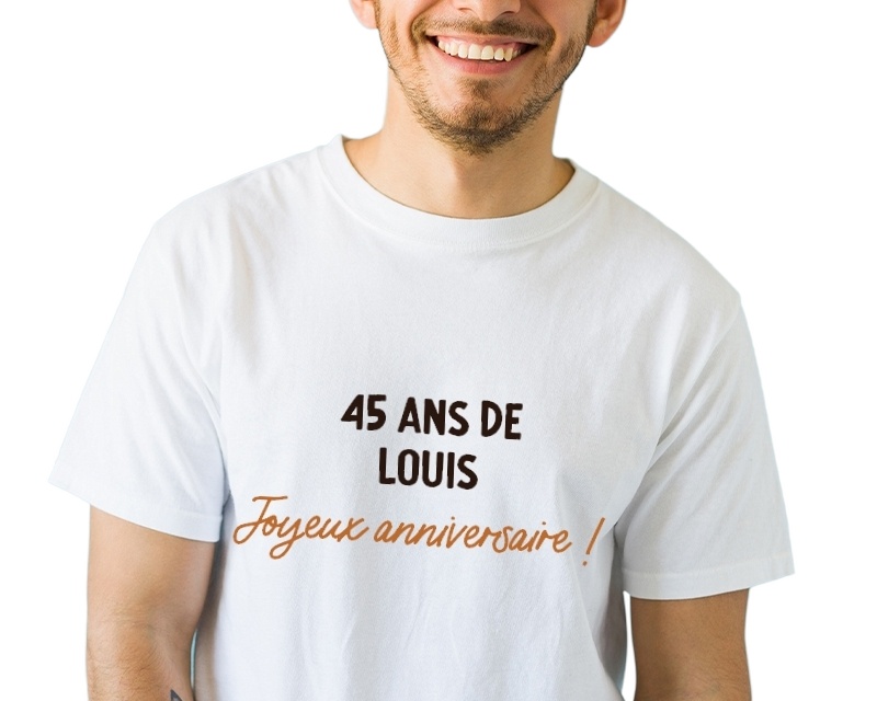 Pour célébrer les 45 ans d'un homme spécial, rien de tel qu'un t-shirt blanc personnalisable pour lui montrer à quel point il compte pour vous. Ce t-shirt blanc homme au message générique est le cadeau parfait pour marquer cette occasion mémorable. Que ce soit pour un anniversaire, la fête des pères ou simplement pour lui faire plaisir, ce t-shirt personnalisé saura toucher le cœur de cet homme de 45 ans.