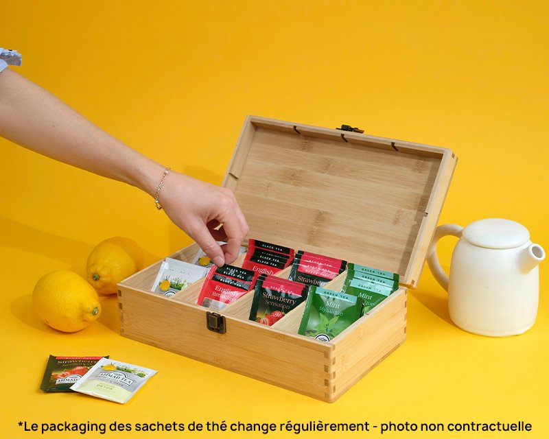 Notre boîte à thé en bois contient 8 compartiments pour vos sachets de thé ou tisanes.