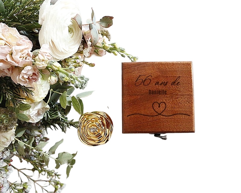 Dans ce magnifique coffret en bois, se cache un trésor précieux : un bouton de rose en or accompagné de sa rose éternelle. Ce cadeau unique et personnalisé est un véritable bijou qui saura toucher le cœur d'une femme de 56 ans, quelle que soit l'occasion.