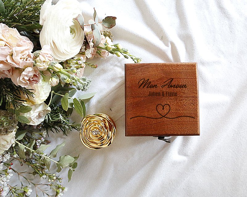 Trois Points Forts du produit : - Bouton de rose en or et sa rose éternelle secrète dans son coffret en bois gravé : Un cadeau précieux qui symbolise l'amour éternel et qui peut être conservé toute une vie. - Personnalisé au laser par nos équipes de Laval en Mayenne : Chaque coffret est unique et personnalisé avec soin, ajoutant une touche d'authenticité et de charme. - Conservation de la rose éternelle : Contrairement aux roses traditionnelles, cette rose éternelle restera éclatante et belle sans faner, offrant une beauté durable et sans entretien.