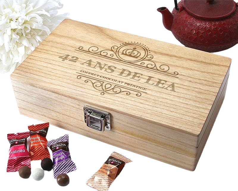 Dans un écrin de douceur et de gourmandise, le coffret bois chocolats Monbana - Prénom est le cadeau idéal pour célébrer les 42 ans d'une femme spéciale. Ce coffret chocolat personnalisé ravira les amateurs de chocolat avec ses 40 savoureuses billes de chocolat Monbana. Imaginez la joie sur le visage de cette femme en découvrant ce coffret cadeau chocolat unique, orné de son prénom gravé avec soin.