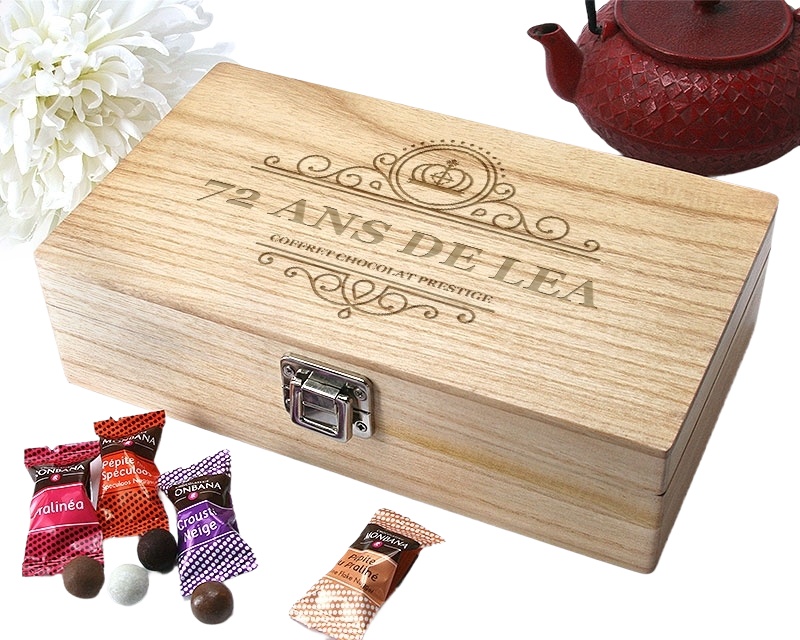Plongez dans un univers de douceur et de délice avec le coffret bois chocolats Monbana personnalisé pour une femme de 72 ans. Ce coffret chocolat personnalisé est un cadeau parfait pour célébrer les 72 ans d'une femme spéciale dans votre vie. Que ce soit pour un anniversaire, la fête des mères, la retraite ou simplement pour lui témoigner votre affection, ce coffret cadeau chocolat sera une attention délicieuse et raffinée.