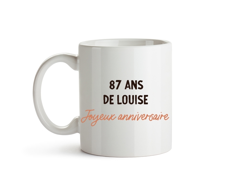 Pour célébrer les 87 ans d'une femme spéciale, quoi de mieux qu'un mug personnalisé ? Imaginez sa joie en recevant une tasse unique, ornée d'un message touchant ou d'une photo précieuse. Le mug personnalisé femme est un cadeau idéal pour toutes les occasions : un anniversaire, la fête des mères, Noël ou simplement pour lui montrer votre amour au quotidien.