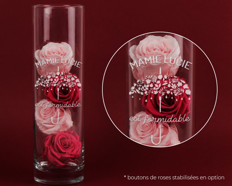 3 Points Forts du produit : - Cadeau original et élégant : Le vase cylindrique personnalisé est une manière unique de témoigner votre amour à travers un cadeau raffiné. - S'accompagne de quatre boutons de roses éternelles en option : Pour une touche de délicatesse qui dure dans le temps. - Personnalisé au laser par nos équipes de Laval en Mayenne : Chaque vase est gravé avec précision pour un rendu parfaitement personnalisé et unique à chaque commande.