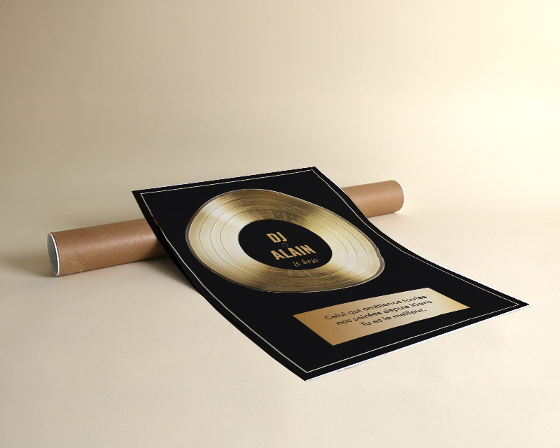 L'affiche disque d'or est un cadeau personnalisé qui saura ravir les amateurs de musique et de décoration. Avec son design authentique inspiré des disques d'or légendaires de l'année 2001, cette création unique apportera une touche rétro et élégante à n'importe quelle pièce.