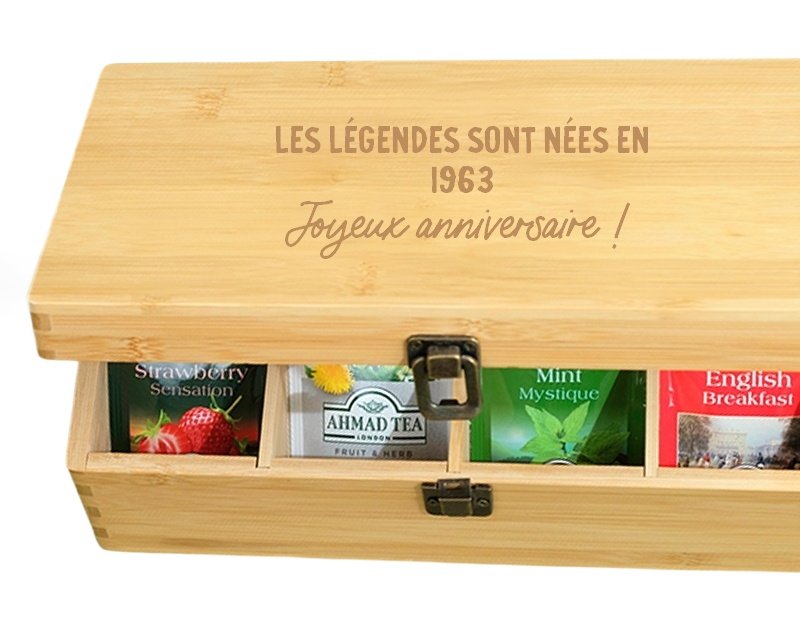 Bienvenue dans notre univers de douceur et de chaleur où chaque détail compte pour rendre un cadeau unique et mémorable. Notre boîte à thé en bois personnalisée est le présent idéal pour célébrer une personne née en 1963. Imaginez offrir un coffret en bois élégant, gravé d'un message personnalisé qui évoque des souvenirs précieux liés à cette année particulière.