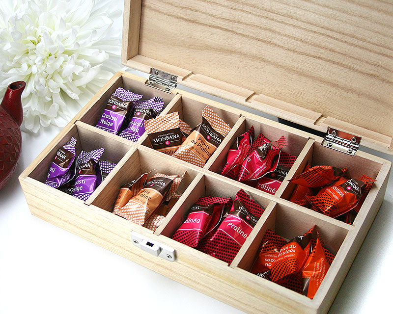 Boîte de chocolat en bois avec 8 compartiments pour les sachets.