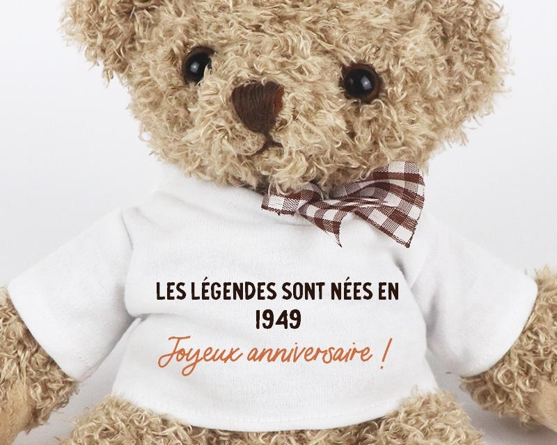 Bienvenue dans l'univers doux et réconfortant de notre peluche ourson personnalisée pour célébrer les 72 printemps d'un être cher né en 1949. Imaginez offrir un ourson tout doux en velours, doté d'un t-shirt blanc prêt à être personnalisé avec un message spécial pour marquer cette année si importante.