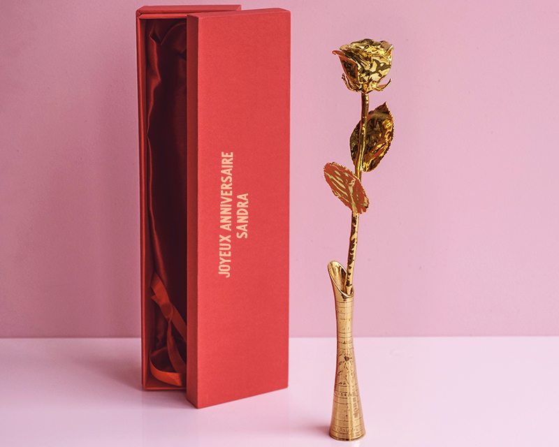 - Écrin rectangulaire personnalisable et garni de soie: Un écrin élégant pour mettre en valeur la rose en or.