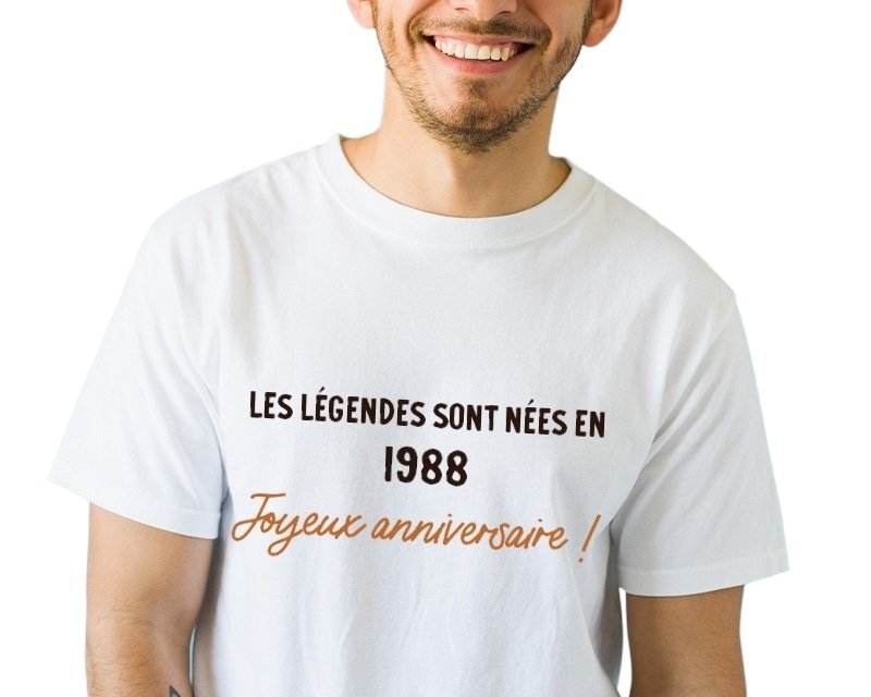 Ce t-shirt blanc pour homme personnalisable est le cadeau idéal pour célébrer une personne née en 1988. Avec sa couleur sobre et son message générique, il s'adapte à toutes les occasions. Que ce soit pour un anniversaire, une fête surprise ou simplement pour témoigner votre affection à un proche, ce t-shirt blanc homme est une valeur sûre. Imaginez le sourire sur le visage de votre ami ou de votre famille en recevant ce cadeau unique qui rappelle l'année de sa naissance.