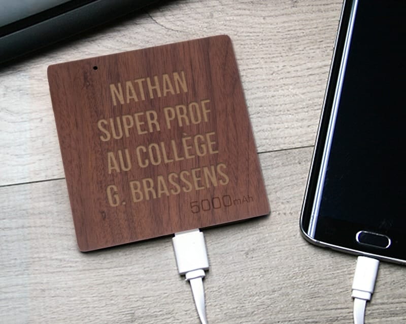 Pour un maître un peu geek, il est aussi possible d’opter pour une batterie externe en bois gravé, qu’il pourra emporter partout avec lui pendant les vacances d’été, à la plage ou en randonnée.