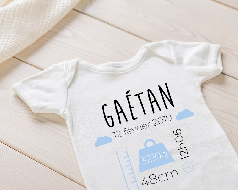 Bébé bien habillé = bébé heureux, promesse de Cadeaux.com ! Voici un body pour bébé garçon qui rendra hommage à ce jour si particulier qu'est son jour de naissance. Unique et utile à vous de le personnaliser avec le prénom, le poids, la taille, la date de naissance et l'heure de ce dernier.