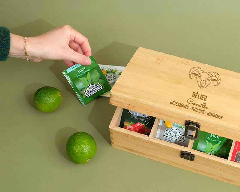 Le gros avantage de cette boîte à thé c'est qu'elle est personnalisable avec le prénom et le signe astrologique de la personne à qui vous voulez l'offrir. Et vous pourrez également, ajouter les termes de votre choix pour décrire cette personne, telle que vous la connaissez. Cette boîte deviendra alors totalement unique, comme elle.