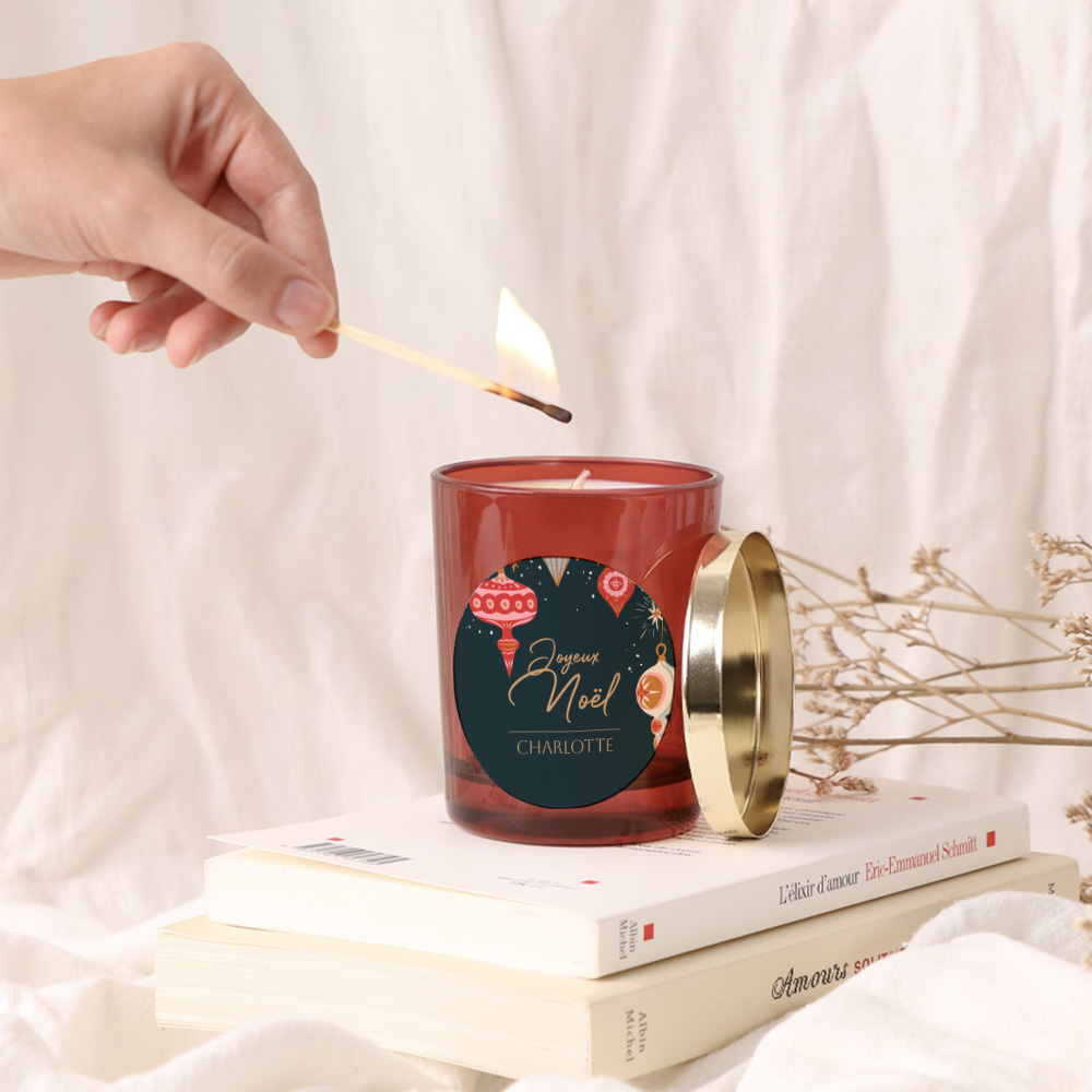 Composez un message court et marquant sur l’étiquette rouge au style chaleureux et festif. Que ce soit un prénom, un mot doux ou un petit inside joke, cette bougie de Noël personnalisée s’adapte à votre intention et s’intègre parfaitement à une déco hivernale.