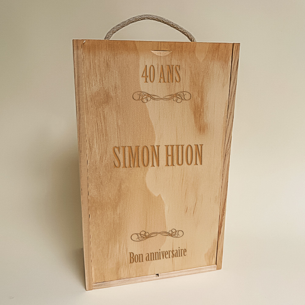 Choisissez l’année marquante, ajoutez un prénom et un court message. La gravure nette révèle le veinage naturel du bois pour un rendu chic. Un coffret vin personnalisé qui deviendra une pièce de décoration autant qu’un bel emballage réutilisable.