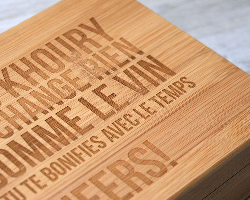 La personnalisation de ce coffret de sommelier pour entreprises en bambou est réalisée par gravure laser dans nos ateliers de Laval.