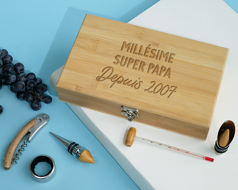 Vous aspirez à élever l'art de la dégustation de vin à un niveau supérieur ou à offrir à un passionné une expérience exceptionnelle ? Notre coffret sommelier personnalisé est un cadeau raffiné incluant un tire-bouchon, un bec verseur, un thermomètre, un stop gouttes et un bouchon de bouteille, tous soigneusement disposés dans un boite en bambou pouvant être personnalisée avec le message de votre choix.