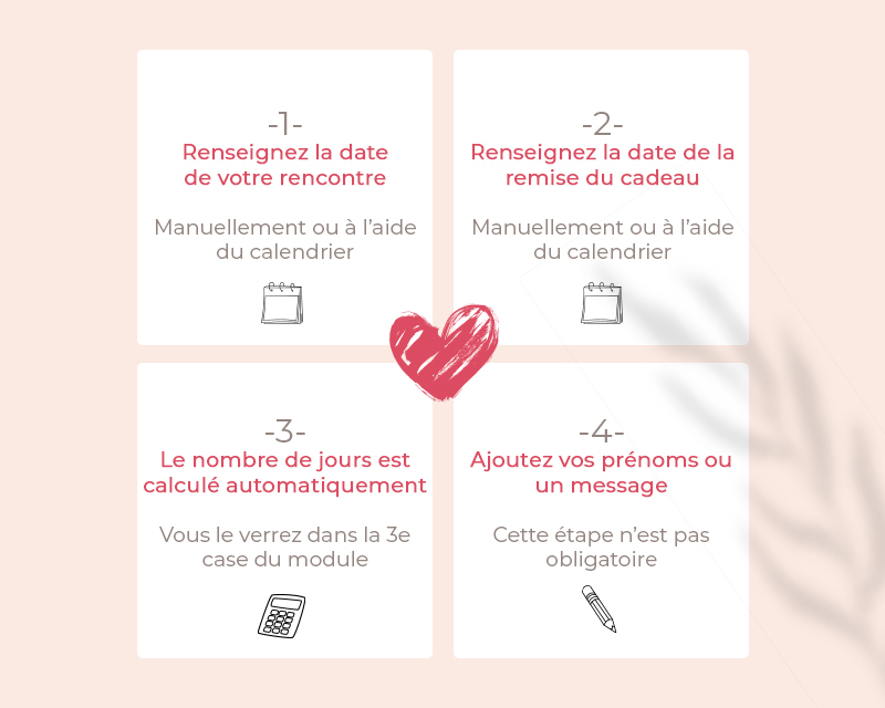 Savez-vous depuis quand vous êtes amoureux exactement ? Grâce à notre calculateur de jours, vous pourrez ainsi savoir le nombre de jours exacts depuis que vous avez rencontré votre moitié ! Ce coussin d'amour devient totalement personnalisé grâce à ce chiffre et au texte qui l'accompagnera.