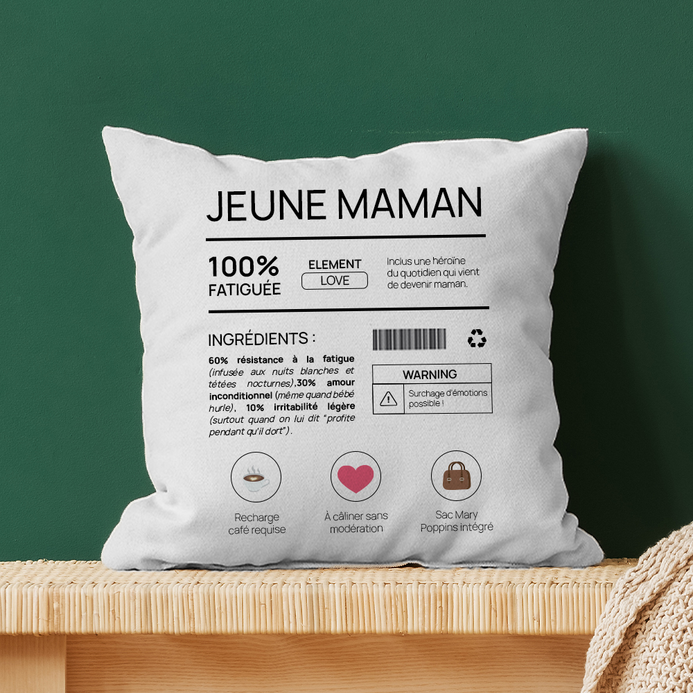 Le coussin personnalisé - Composition d'une jeune maman est un clin d'œil tendre et plein d'humour au quotidien de toutes les jeunes mamans. Inspiré des étiquettes nutritionnelles, son design structuré en noir et blanc met en lumière les ingrédients essentiels de la maternité : amour infini, résistance à la fatigue, super-pouvoirs... Le tout accompagné de pictogrammes délicats et d’une personnalisation possible avec un prénom ou un surnom affectueux pour créer un coussin souvenir unique et émouvant.