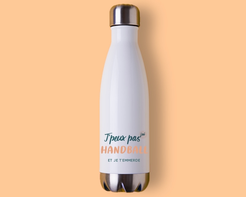 Vous cherchez une gourde qui vous permettra de rester hydraté(e) tout en montrant votre amour pour le handball ? Ne cherchez plus, la gourde personnalisable "J'peux pas j'ai handball" est là pour vous ! Cette gourde isotherme, ou plutôt cette bouteille thermos (oui, on sait que ça n'a rien à voir avec une vraie gourde), est parfaite pour les sportifs et les sportives qui veulent garder leur boisson préférée à portée de main pendant l'entraînement. Et si vous avez besoin d'une pause pipi pendant le match, pas de soucis, le bouchon étanche vous évitera toute fuite embarrassante.