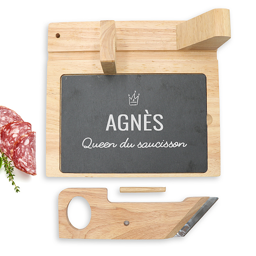 Donnez une touche personnelle à ce cadeau en y ajoutant le prénom de votre choix, et soyez prêt à impressionner vos convives avec une dégustation de saucisson digne de rois et reines de l'apéro.