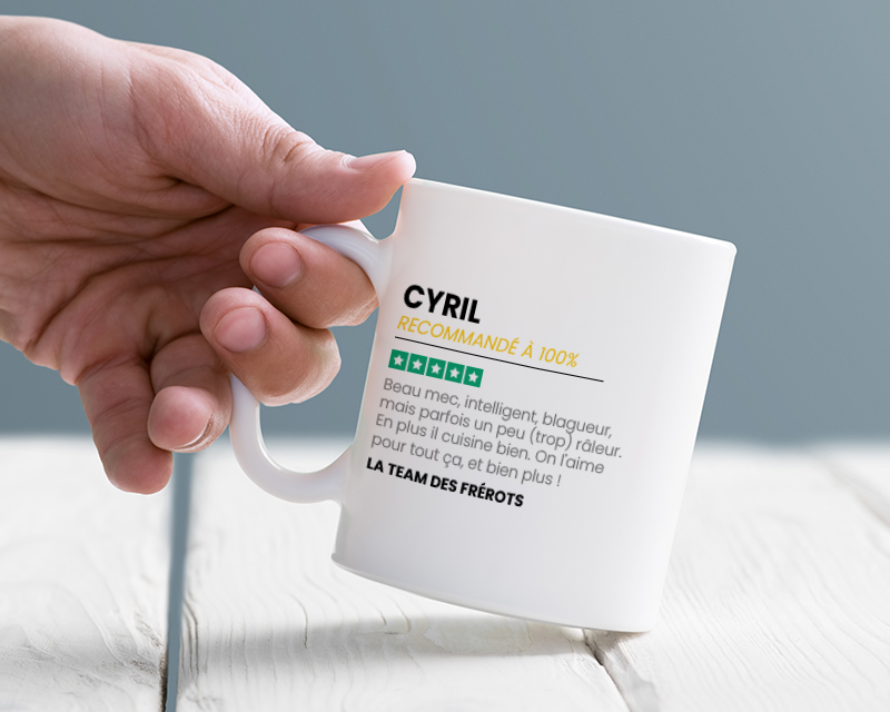 Pour tous ceux et celles qui aiment offrir des cadeaux uniques, même en matière de vaisselle, nous avons la solution idéale : notre mug personnalisable avis 5 étoiles ! Imaginez offrir à vos proches un mug où leur prénom est inscrit en gros, avec un affichage de 5 étoiles d'avis, et bien sûr, une phrase hilarante qui décrit à la perfection leur personnalité unique. Que ce soit pour vanter leur sens de l'humour légendaire ou pour souligner leur talent inné pour briller dans toutes les situations, ce mug personnalisé fera ressortir leur éclat intérieur.
