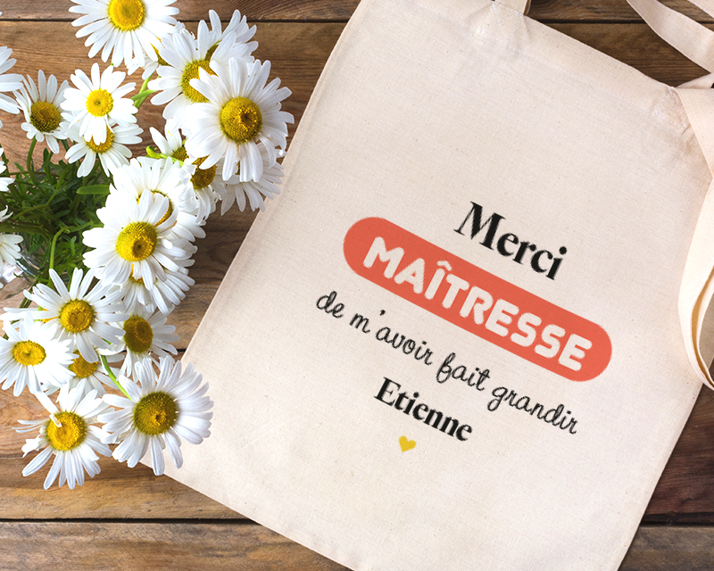 Lorsque l'été approche, vous cherchez un cadeau de fin d'année scolaire pour que votre enfant puisse exprimer sa gratitude envers sa maîtresse, son ATSEM, son AVS ou son AESH ? Pourquoi ne pas choisir un tote bag personnalisé avec un message de remerciement choisi par vous ? Ce petit cadeau original pour maîtresse fera son effet et vous pouvez même l'accompagner d'un mug ou d'une gourde personnalisés, pour un ensemble complet.