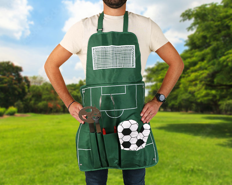 Tablier barbecue foot, livré avec 3 ustensiles de cuisine et un gant.