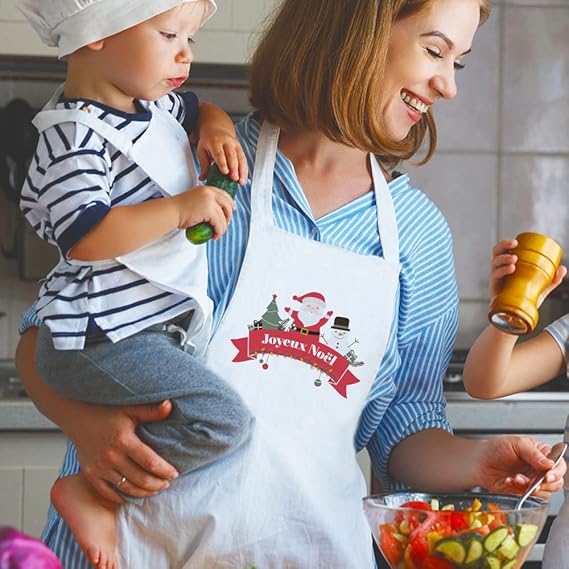 Faites entrer la magie de Noël dans votre cuisine avec ce superbe tablier “Joyeux Noël” ! Orné d’un adorable Père Noël et de son bonhomme de neige, il apportera une touche de bonne humeur et de convivialité à toutes vos préparations de fêtes.
