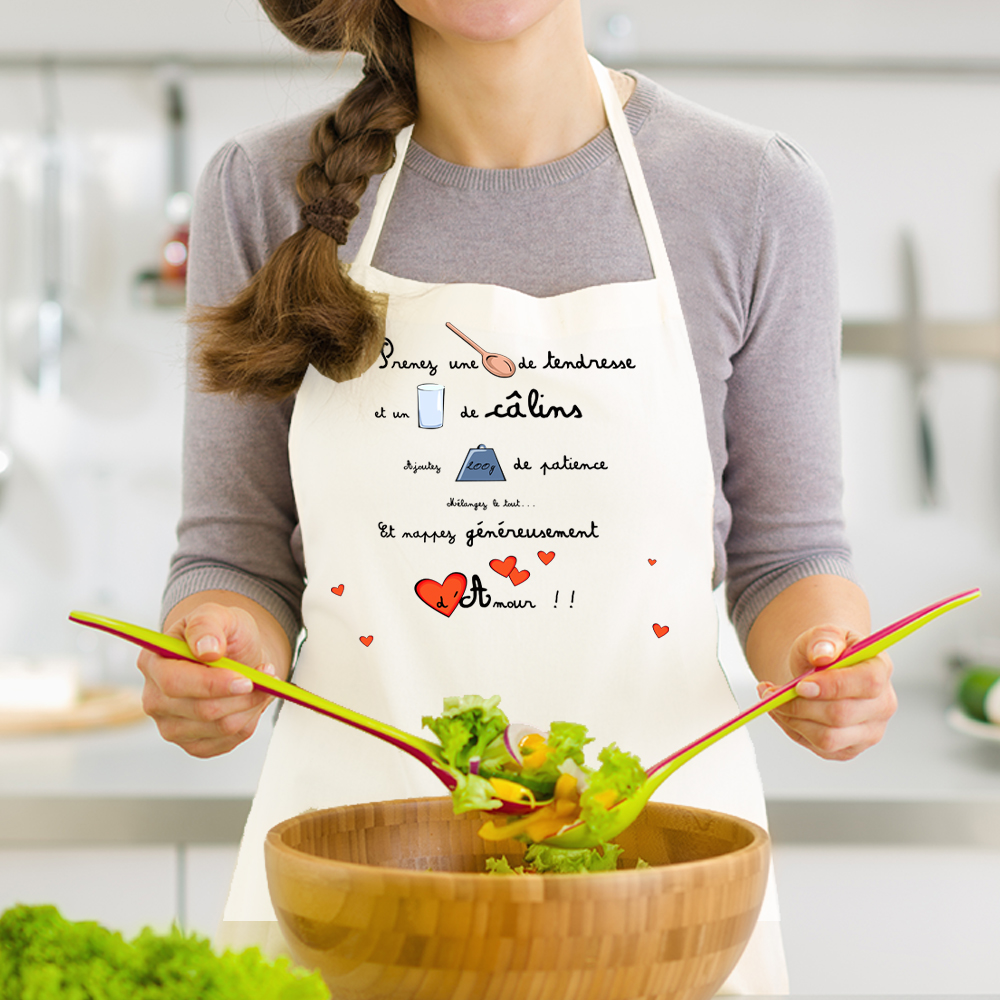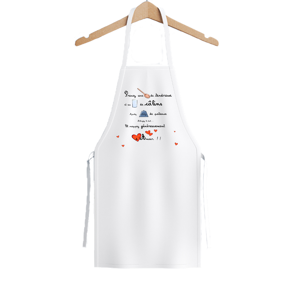 Mettez une pincée de douceur et beaucoup de bonne humeur dans votre cuisine avec ce charmant tablier “Recette d’amour”. Imprimé d’un texte poétique et plein d’affection, il rappelle que les meilleurs plats se préparent toujours avec le cœur.