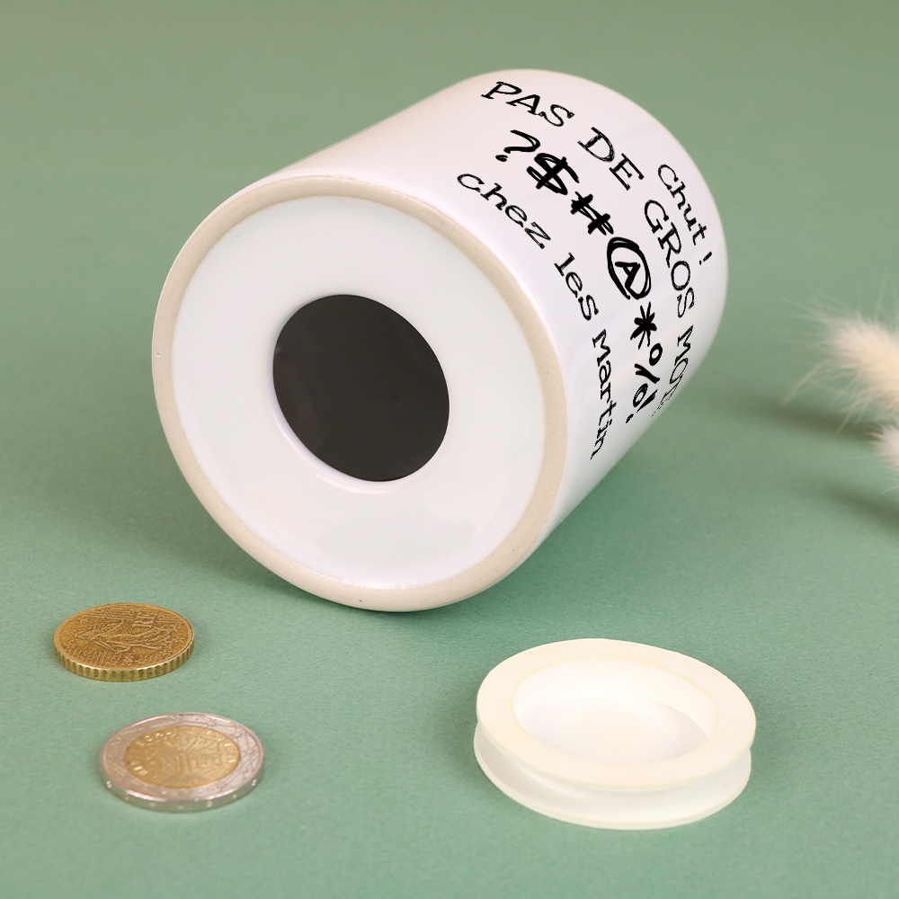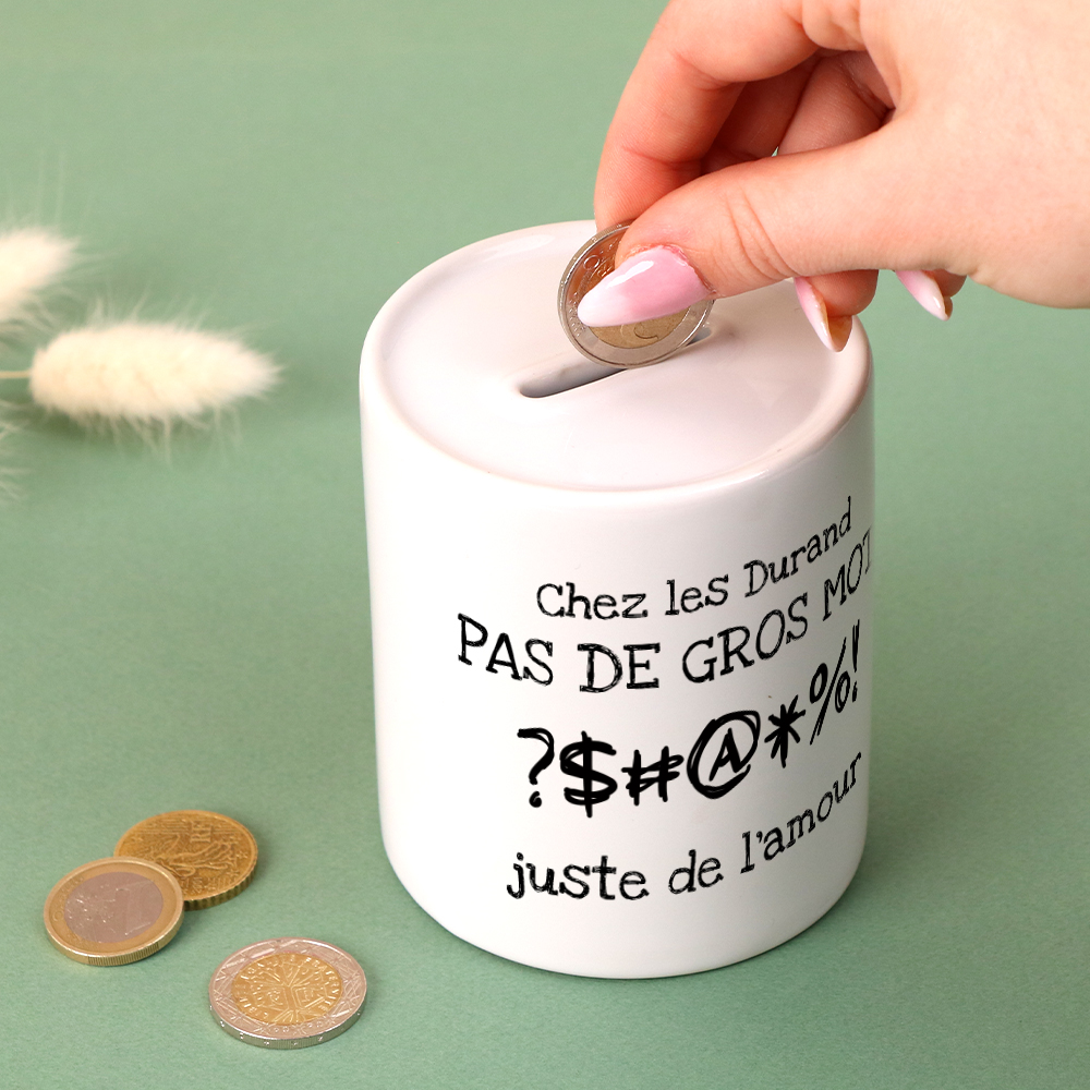 Un peu d'humour et beaucoup de bonne humeur pour faire passer les messages en douceur. Cette tirelire personnalisée est pensée pour les familles qui aiment rire ensemble. Son design décalé autour des gros mots en fait un objet ludique, parfait pour instaurer une règle amusante à la maison.